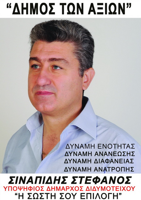 Με αίσθημα ευθύνης και πιστεύοντας ότι προσφέρουμε στον τόπο μας, ζητούμε την υποστήριξή σας στον συνδυασμό μας «ΔΗΜΟΣ ΤΩΝ ΑΞΙΩΝ» που έχει επικεφαλής, τον συμπολίτη μας Ιατρό Καρδιολόγο Σιναπίδη Στέφανο...»