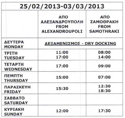 Μετά από έγκριση του Υπουργείου Ναυτιλίας και Αιγαίου τα δρομολόγια για τις ημέρες πριν την αναχώρηση του πλοίου στον Πειραιά αλλά και για την πρώτη ημέρα μετά την επιστροφή του στη Σαμοθράκη θα διαμορφωθούν ως ακολούθως:
