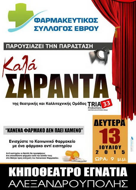 Ο Φαρμακευτικός Σύλλογος Έβρου και το Κοινωνικό Φαρμακείο Αλεξανδρούπολης, σε συνεργασία με τη Θεατρική και Καλλιτεχνική Ομάδα ΤΡΙΑ-33, παρουσιάζουν τη Δευτέρα 13 Ιουλίου 2015, στις 9:00 μ.μ. στο Κηποθέατρο Αλεξανδρούπολης τη θεατρική παράσταση «Καλά Σαράντα»