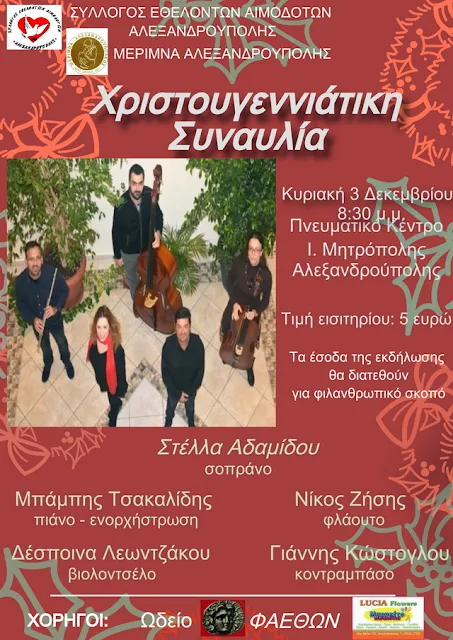 Ο Σύλλογος Εθελοντών Αιμοδοτών Αλεξανδρούπολης και ο Φιλανθρωπικός Σύλλογος «Μέριμνα Αλεξανδρούπολης» σας προσκαλούν στο ρεσιτάλ τραγουδιού, με την σοπράνο Στέλλα Αδαμίδου, με την συνοδεία του συνθέτη - πιανίστα Μπάμπη Τσακαλίδη και άλλων μουσικών, μελών και φίλων του Συλλόγου Εθελοντών Αιμοδοτών, που θα πραγματοποιηθεί την Κυριακή 3 Δεκεμβρίου 2017 και ώρα 20:30 στην αίθουσα του Πνευματικού Κέντρου της Μητρόπολης Αλεξανδρούπολης (παραπλεύρως του Μητροπολιτικού Ναού Αγίου Νικολάου).