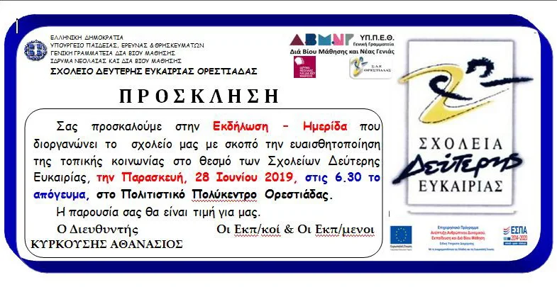 Το Σχολείο Δεύτερης Ευκαιρίας Ορεστιάδας σας προσκαλεί στην Εκδήλωση - Ημερίδα που διοργανώνει με σκοπό την ευαισθητοποίηση της τοπικής κοινωνίας στο θεσμό των Σχολείων Δεύτερης Ευκαιρίας.