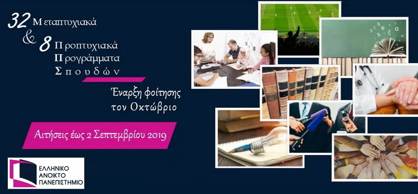 Το Ελληνικό Ανοικτό Πανεπιστήμιο (Ε.Α.Π.) στην επίσημη ιστοσελίδα του (www.eap.gr) έχει αναρτήσει την κάτωθι Πρόσκληση Εκδήλωσης Ενδιαφέροντος Φοίτησης σε 8 Προπτυχιακά και 32 Μεταπτυχιακά Προγράμματα Σπουδών με έναρξη φοίτησης τον Οκτώβριο του 2019.