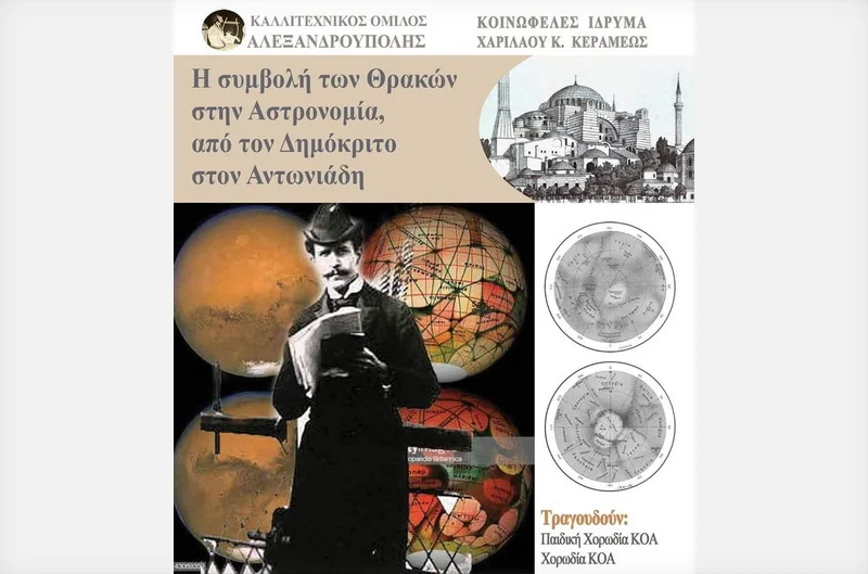Ο Καλλιτεχνικός Όμιλος Αλεξανδρούπολης σας προσκαλεί να τιμήσετε με την παρουσία σας την εκδήλωση με θέμα: «Η συμβολή των Θρακών στην Αστρονομία, από τον Δημόκριτο στον Αντωνιάδη» με ομιλητή τον κ. Ταρσούδη Γεώργιο, Μηχανικό Βιοϊατρικής, Ερασιτέχνη Αστρονόμο, το Σάββατο 23 Νοεμβρίου 2019 και ώρα 19:30 στο Δημοτικό Θέατρο Αλεξανδρούπολης.
