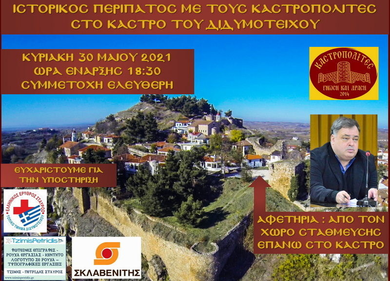 Ο Ιστορικός και Πολιτιστικός Σύλλογος Διδυμοτείχου «Καστροπολίτες - Γνώση και Δράση» διοργανώνει την Κυριακή 30 Μαΐου 2021 έναν ιστορικό περίπατο στο Κάστρο του Διδυμοτείχου, με ξεναγό το Δρ. Θανάση Γουρίδη (Πολιτικό Μηχανικό - Αρχαιολόγο).