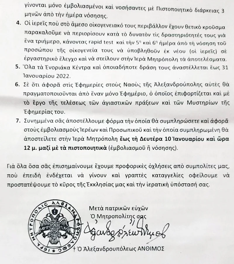 Πιο συγκεκριμένα, ο Μητροπολίτης Αλεξανδρουπόλεως «απαγορεύει πλέον σε κάθε ανεμβολίαστο κληρικό να συμμετέχει σε οποιαδήποτε αγιαστική πράξη, εκτός του ιερού ναού του, δεν επιτρέπονται οι κατ΄ οίκον επισκέψεις, ούτε οι Ιεροπραξίες στα Κοιμητήρια», διευκρινίζοντας συγχρόνως πως θα απαγορεύεται εξίσου να τελούν και κηδείες. «Σε περίπτωση κηδείας ο ανεμβολίαστος κληρικός να απευθύνεται στον πλησιέστερο εμβολιασμένο κληρικό ή τον Πρωτοσύγκελο της Μητρόπολης», τονίζει.
