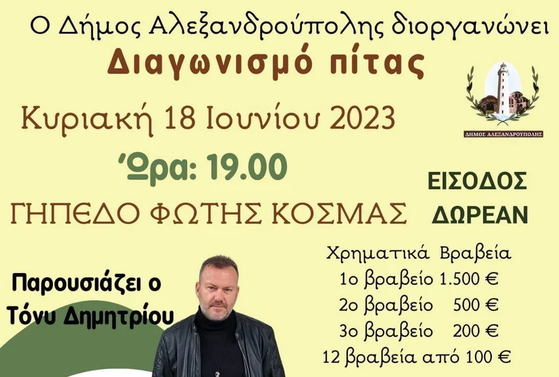 Με στόχο την ανάδειξη και την προώθηση της τοπικής παραδοσιακής κουζίνας της Θράκης, ο Δήμος Αλεξανδρούπολης διοργανώνει την εκδήλωση «Διαγωνισμός Πίτας» την Κυριακή 18 Ιουνίου και ώρα 19:00 στο στάδιο "Φώτης Κοσμάς" στην Αλεξανδρούπολη, με την υποστήριξη του Πολιτιστικού - Λαογραφικού Συλλόγου Αγνάντιας "Άγιος Γεώργιος" και του Πολιτιστικού Επιμορφωτικού Συλλόγου Λουτρού.