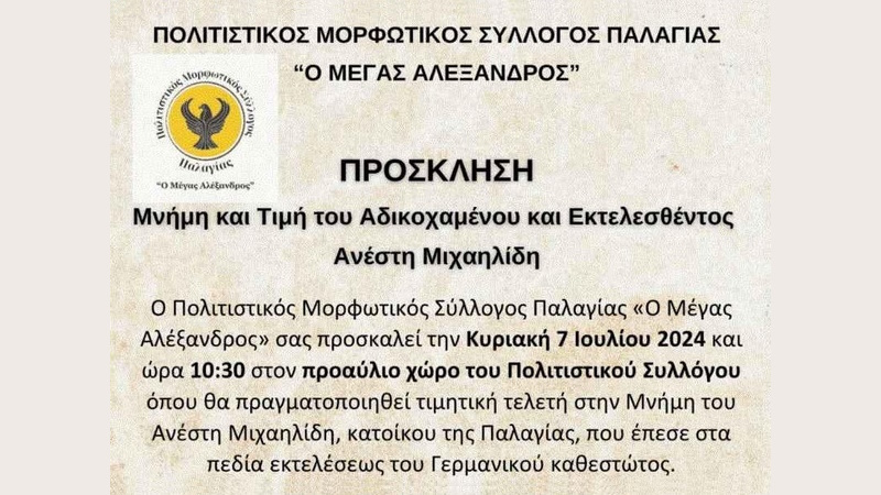 Ο Πολιτιστικός Μορφωτικός Σύλλογος Παλαγίας "Ο Μέγας Αλεξάνδρος" διοργανώνει, την Κυριακή 7 Ιουλίου 2024 και ώρα 10:30 π.μ. στον προαύλιο χώρο του συλλόγου στην πλατεία της Παλαγίας Αλεξανδρούπολης, τιμητική εκδήλωση στη μνήμη του Ανέστη Μιχαηλίδη, κατοίκου Παλαγίας, ο οποίος εκτελέστηκε, μαζί με άλλους 7 πατριώτες, από τις γερμανικές κατοχικές δυνάμεις στις 30 Ιουνίου 1944 στυ Σουφλί.