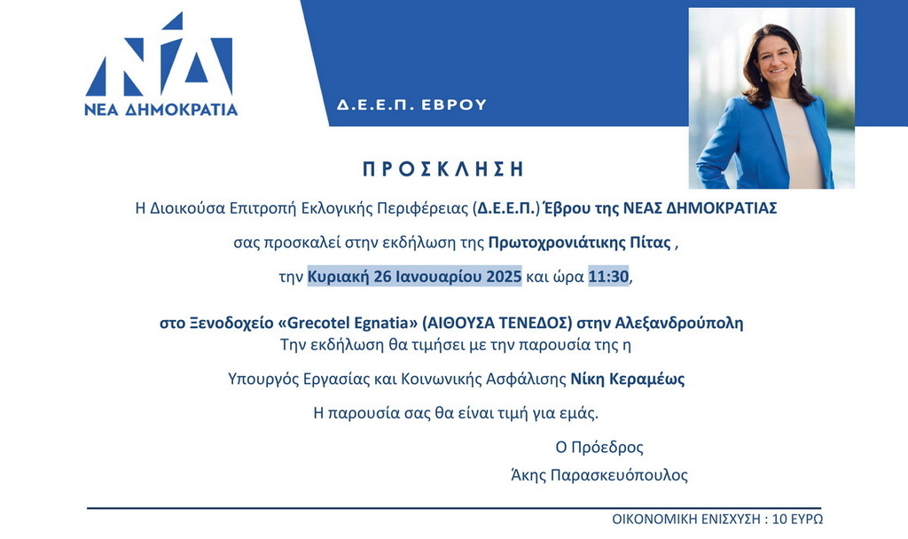 Η Διοικούσα Επιτροπή Εκλογικής Περιφέρειας (Δ.Ε.Ε.Π.) Έβρου της ΝΕΑΣ ΔΗΜΟΚΡΑΤΙΑΣ σας προσκαλεί στην εκδήλωση κοπής της Πρωτοχρονιάτικης πίτας, την Κυριακή 26 Ιανουαρίου 2025 και ώρα 11:30 π.μ. στο Ξενοδοχείο Grecotel Egnatia (Αίθουσα ΤΕΝΕΔΟΣ) στην Αλεξανδρούπολη.
