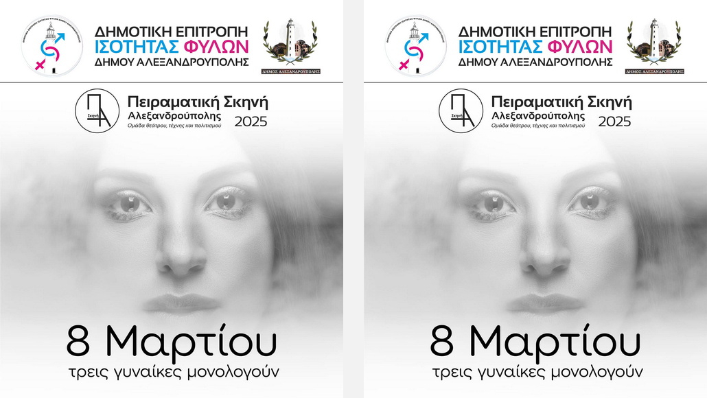 Η Πειραματική Σκηνή Αλεξανδρούπολης, αποδεχόμενη την πρόσκληση της Δημοτικής Επιτροπής Ισότητας του Δήμου Αλεξανδρούπολης, παρουσιάζει την παράσταση «Τρεις γυναίκες μονολογούν».